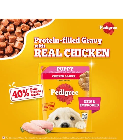 - Delicious Flavour: Pedigree Puppy Wet Dog Food, Chicken & Liver Chunks in Gravy, is made with real meat, high quality protein and contains a gravylicious flavour.