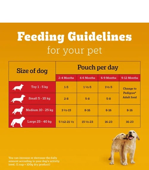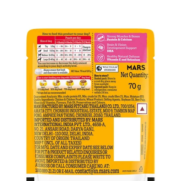 Gravy Puppy dog food with made with Meat and Meat by-products, Chicken and Chicken by-products make every mealtime a fusion of taste and nutrition for your Dog with Pedigree. Made with real meat and high quality protein, ensures that you are providing a meal that keeps your dog happy and supports their well-being. This exciting meal is packed with gravylicious chicken & liver chunks that your furry companion will love. Packed with essential nutrients, it is a 100% complete and balanced meal that provides your dog with all the nutrients to stay healthy and strong. Protein & Calcium support healthy muscles & bones while Dietary Fibre supports a healthy digestive system. Omega 6 and Zinc help keep your dog’s skin and coat healthy. The water content in the meal ensures your dog is well-hydrated. At Pedigree, recipes are developed based on research from the Waltham Centre for Pet Nutrition. Every product from Pedigree meets the requirements laid down by NRC 2006 of the U.S. National Academy of Science.