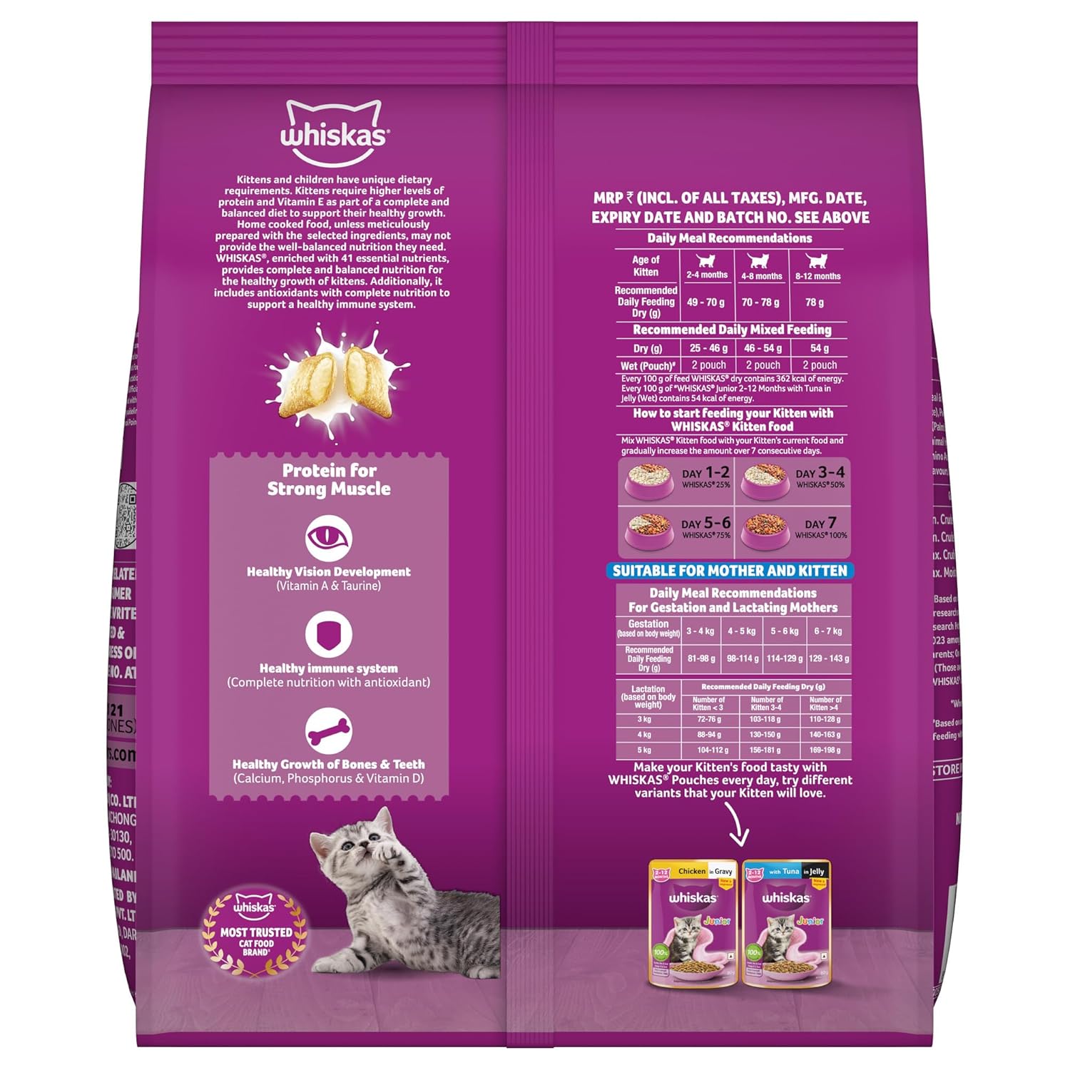 - Suitable for All Kittens: Whiskas Kitten Dry Food is suitable for kittens aged 2 to 12 months, providing them with the nutrition they need for optimal development. It’s also suitable for mother cats.